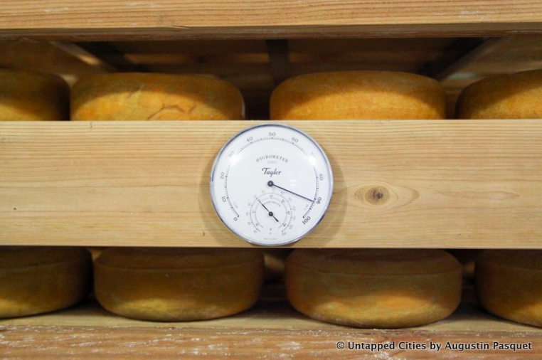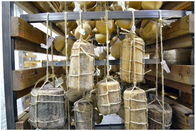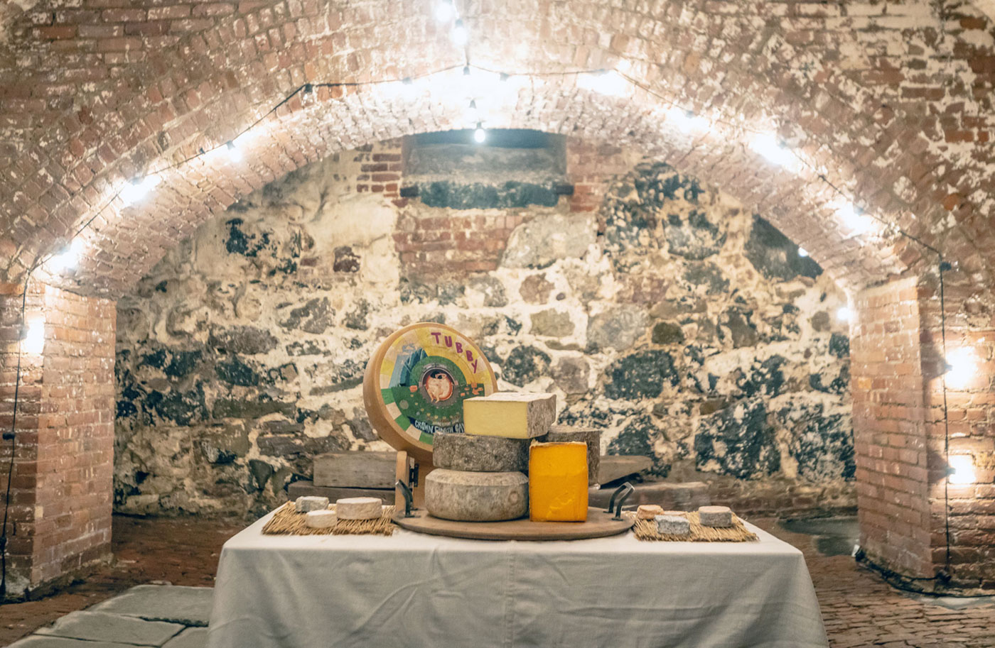 Thirty feet below the street, our caves were originally designed for fermenting beer. With an average year round temperature of 50 degrees Fahrenheit they also happen to provide the perfect environment for aging cheese! This is a centuries old practice called "affinage." A prominent industry throughout Europe. We receive "green cheese", or young cheese that hasn't developed a rind yet, coming from local artisan producers as well as from one as far away as Italy! Then we age it to perfection. Our main tunnel currently holds 28,000 pounds of cheese, and it's almost full